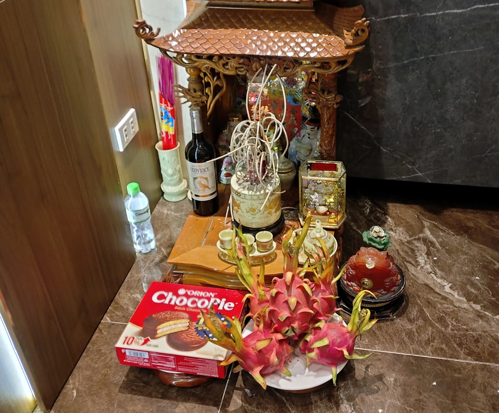 Zu dem Ahnenkult gehören kleine Hausaltäre, auf denen den Ahnen Kekse, Süßigkeiten, Früchte, Getränke, etc. dargeboten werden, also alles was sie früher als Menschen gerne gegessen und getrunken haben. Dadurch sollen sie besänftigt oder wohl gestimmt werden, damit sie nicht als böse Geister wiederkehren und Chaos oder Unheil verbreiten, sondern stattdessen für Harmonie, Wohlstand und Gesundheit sorgen.