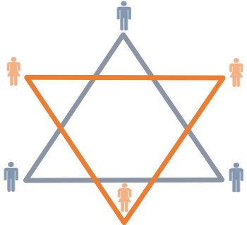 mit den sechs Teilnehmern in den „Spitzen“ des Hexagramms um sie herum.